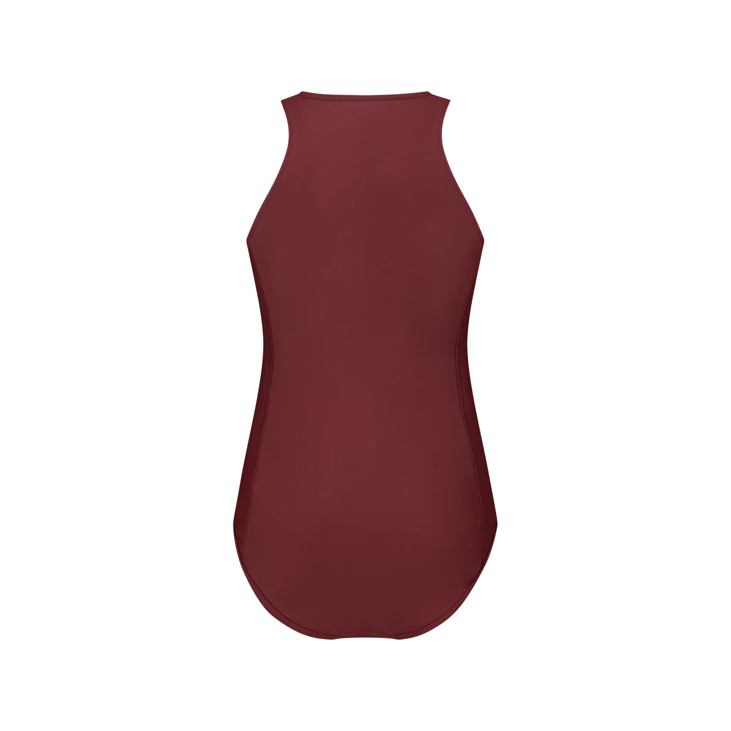 Back view of red high neck full coverage swimsuit with seamless finish tailored for training and support, on white background
