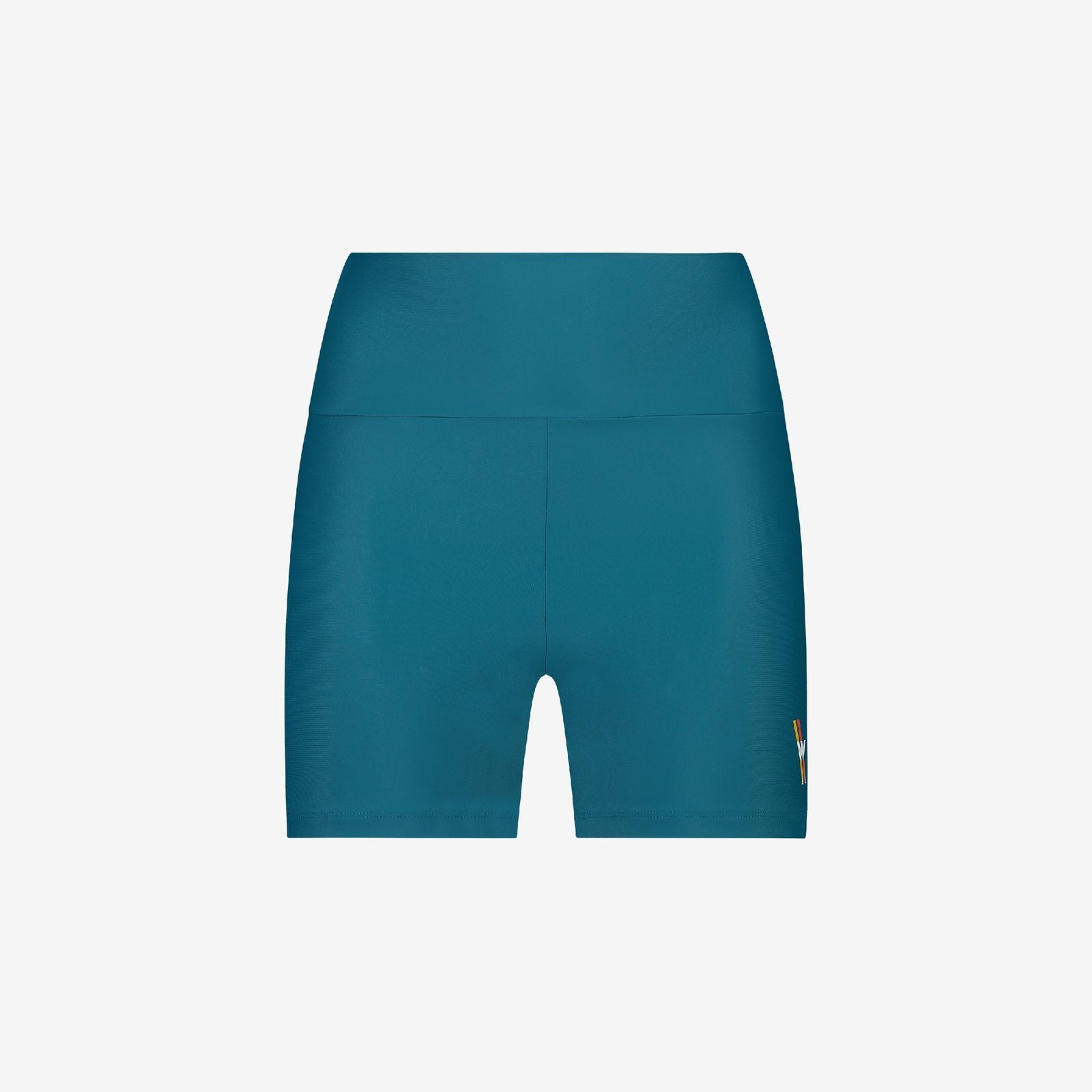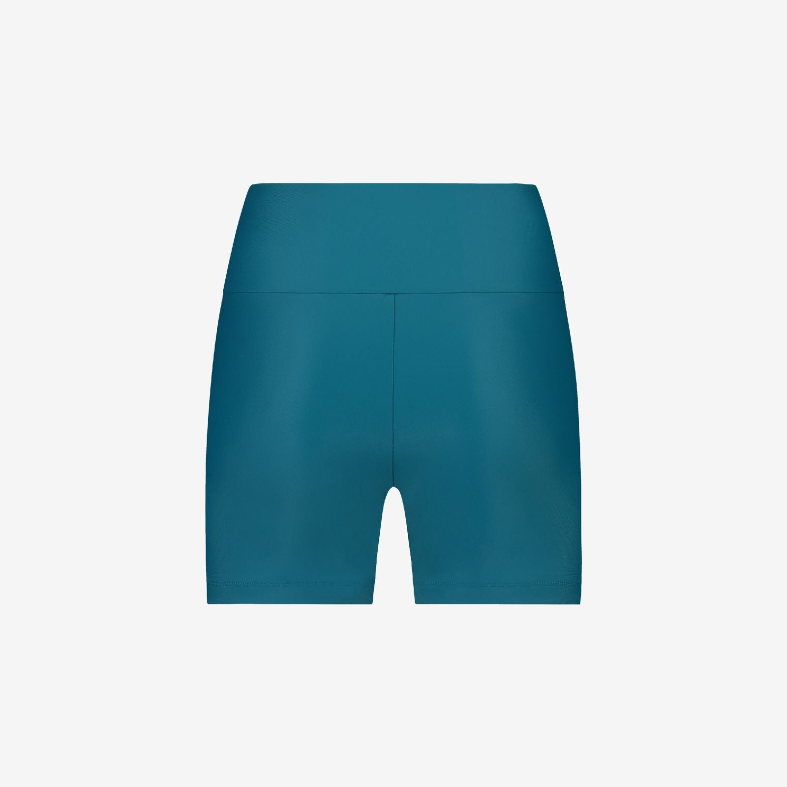 Teal performance sport shorts with mid-rise fit and smooth stretch waistband, ideal for water sports, on a white background