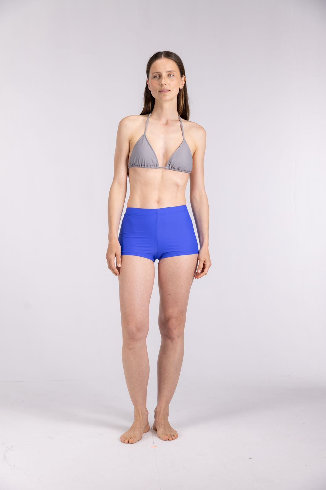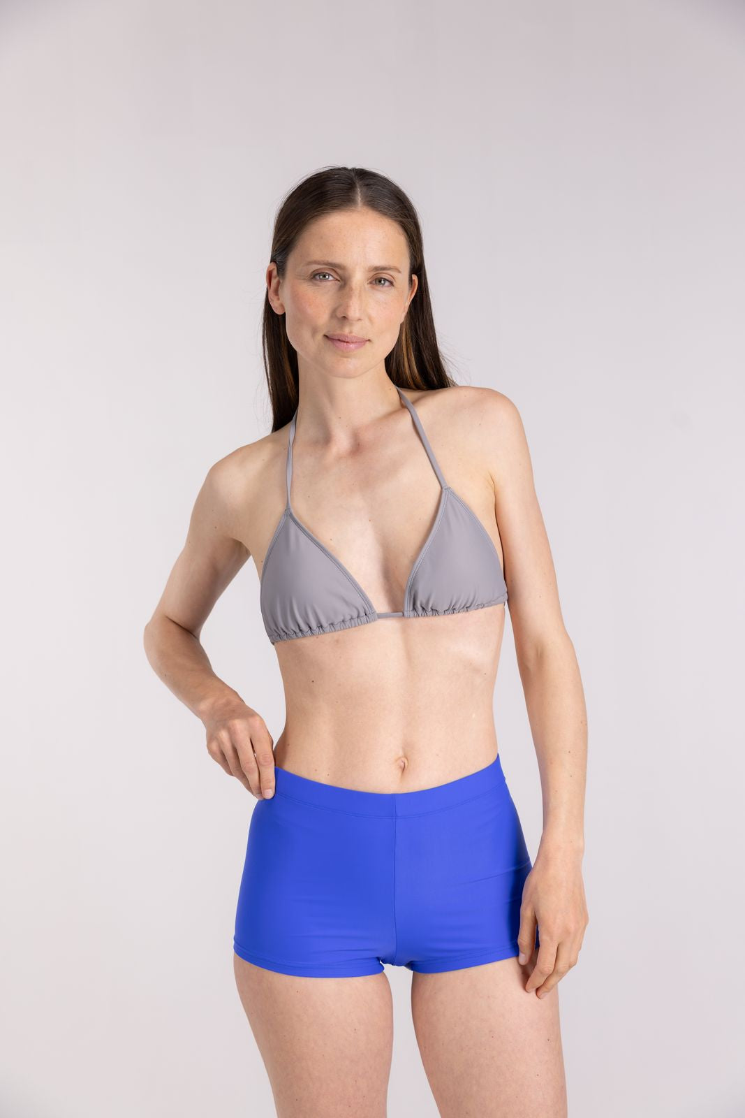 Seal grey bikini top styled for active beachwear, model in standing pose with cobalt shorts, light backdrop studio setting