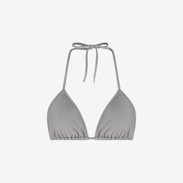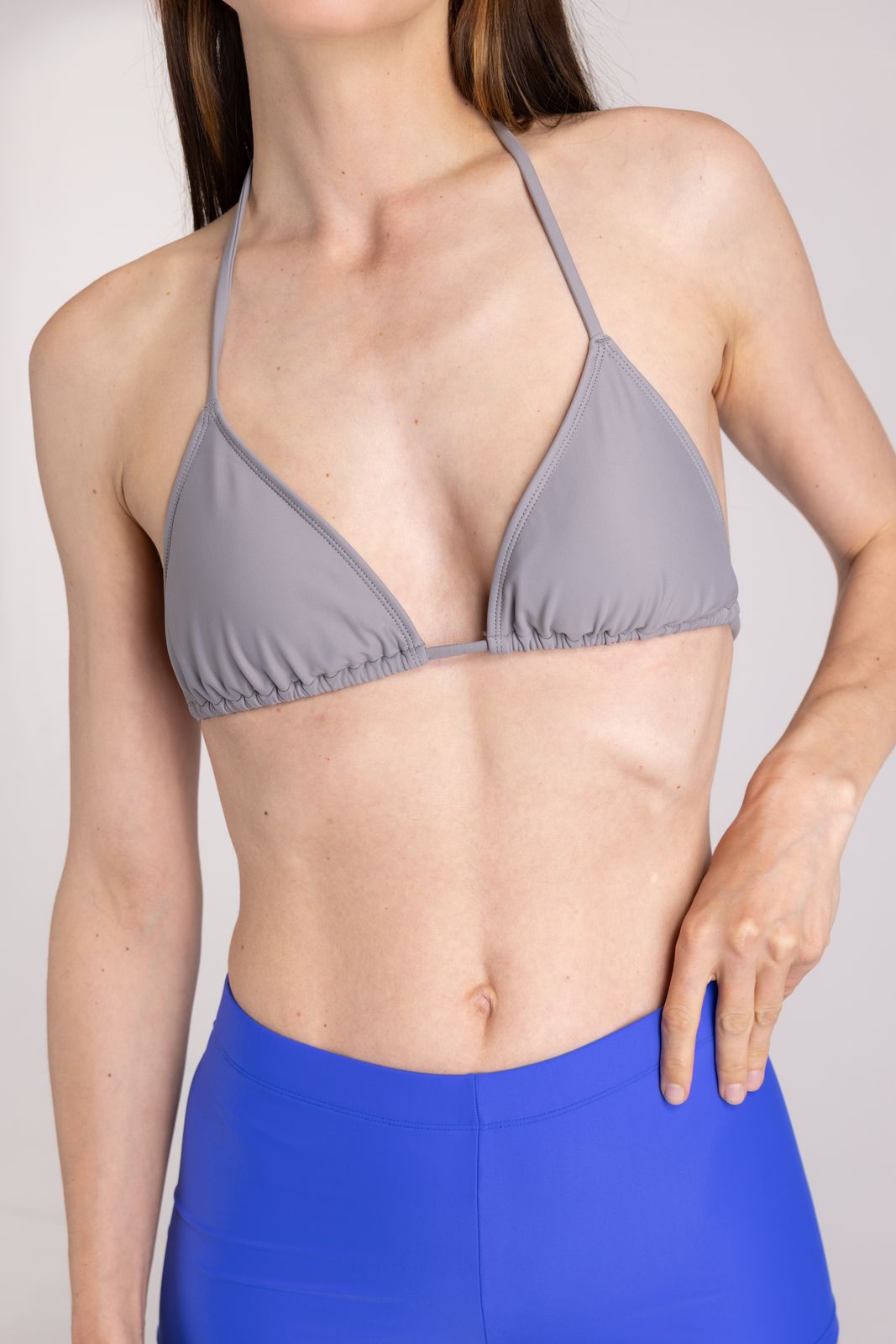 Seal Grey bikini top with triangle cups, adjustable halter ties, and gathered seams, active swimwear on a white background