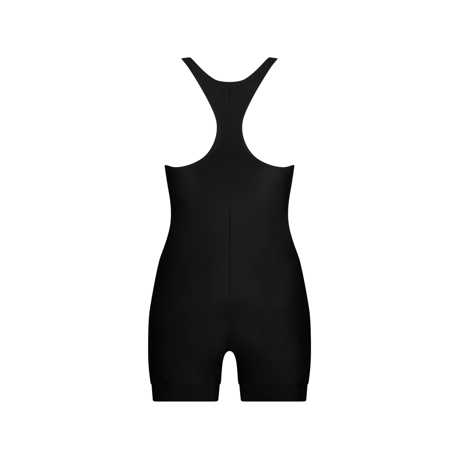 Black one-piece swimsuit with boyleg straps and clean seams, designed for women's performance swim, on a white background