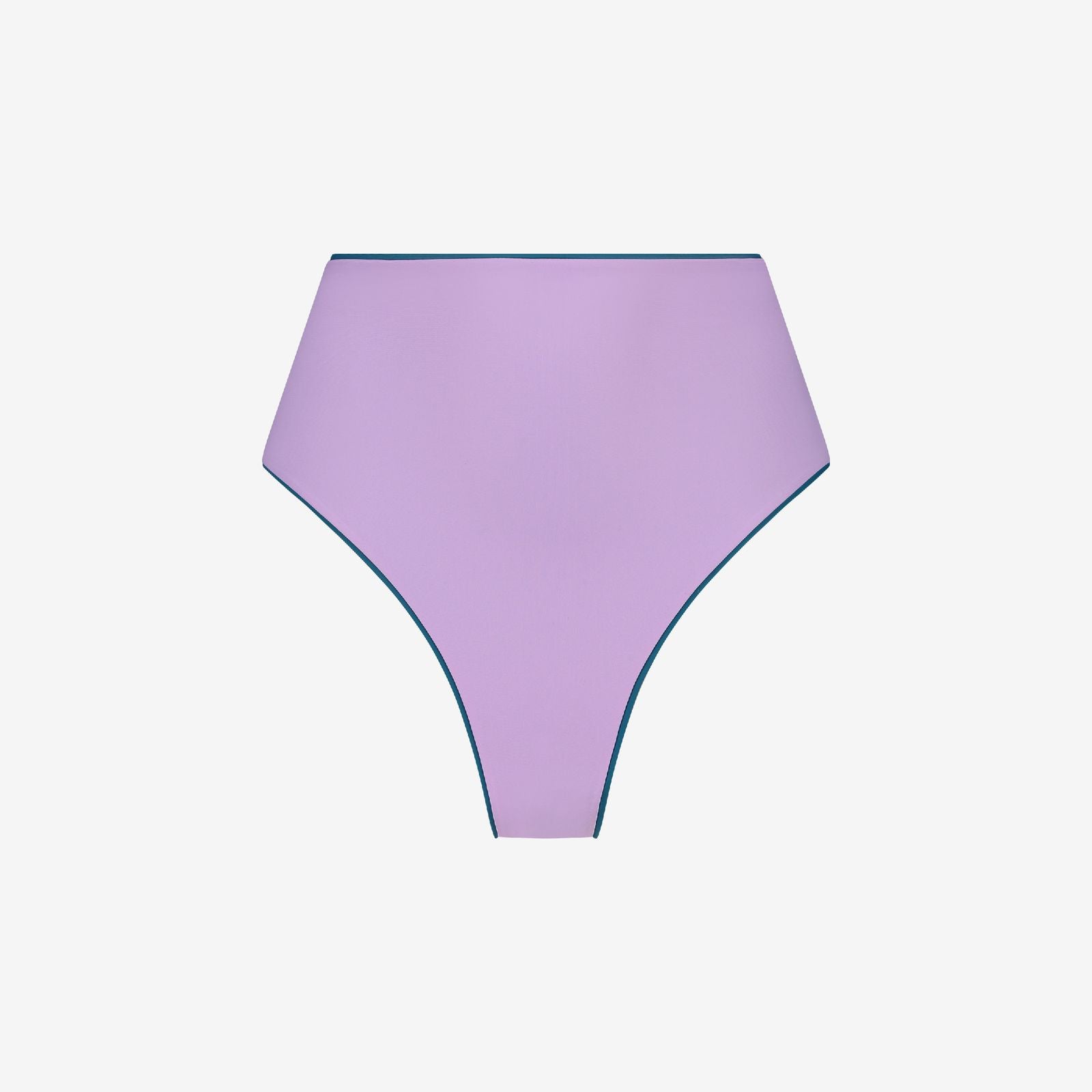 Purple high waist reversible bikini bottom with contrast teal edging and smooth finish, for water sports, on white background