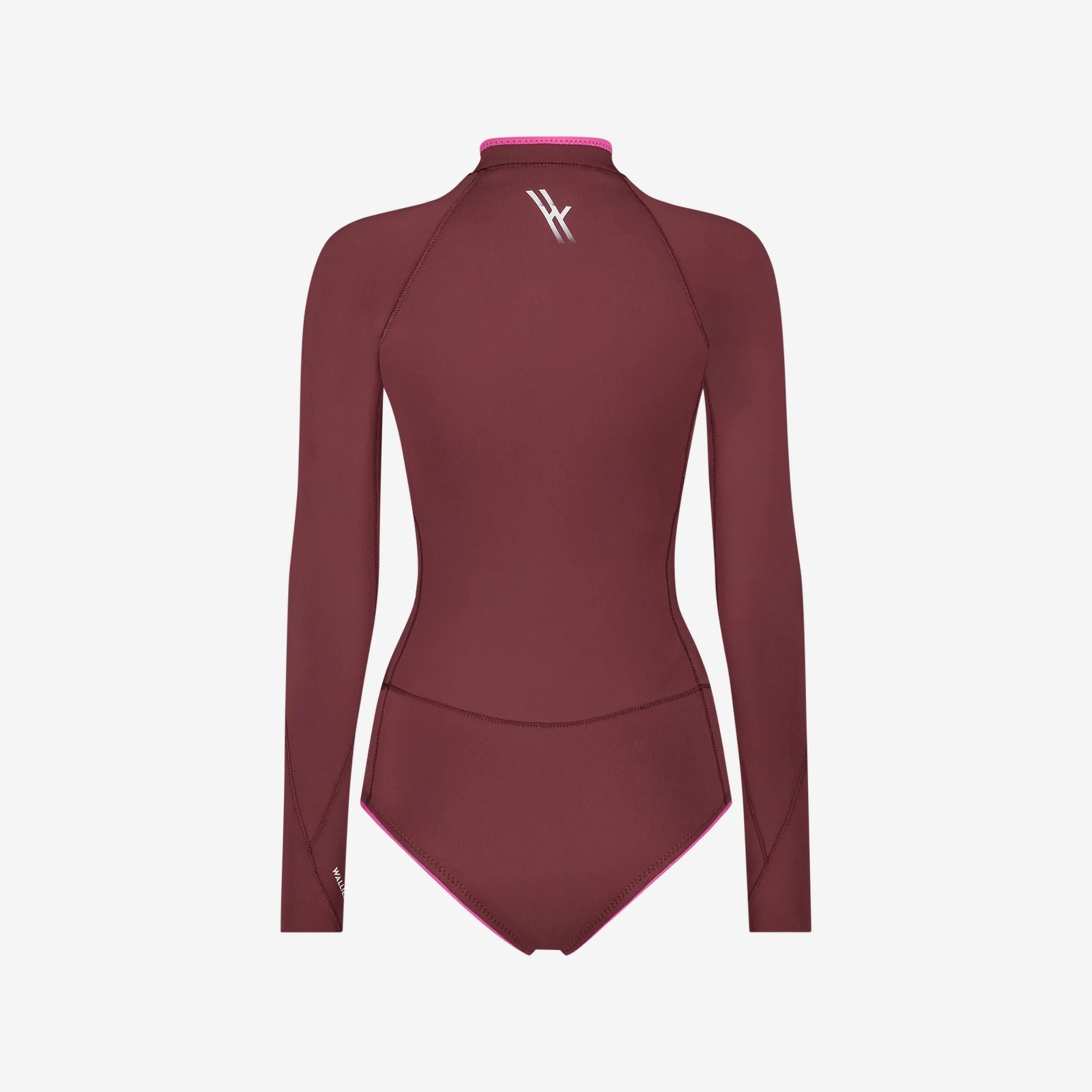 Back view of red Yulex® springsuit wetsuit with contoured seams and WALLIEN logo, eco-friendly design, on white background