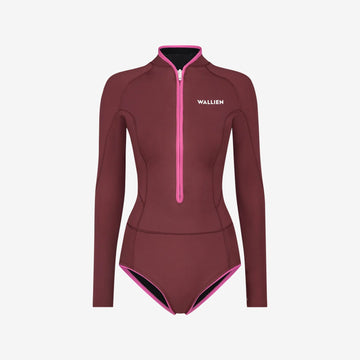 Woman adjusting red WALLIEN springsuit wetsuit, half zipped, made from sustainable Yulex®, captured in studio background