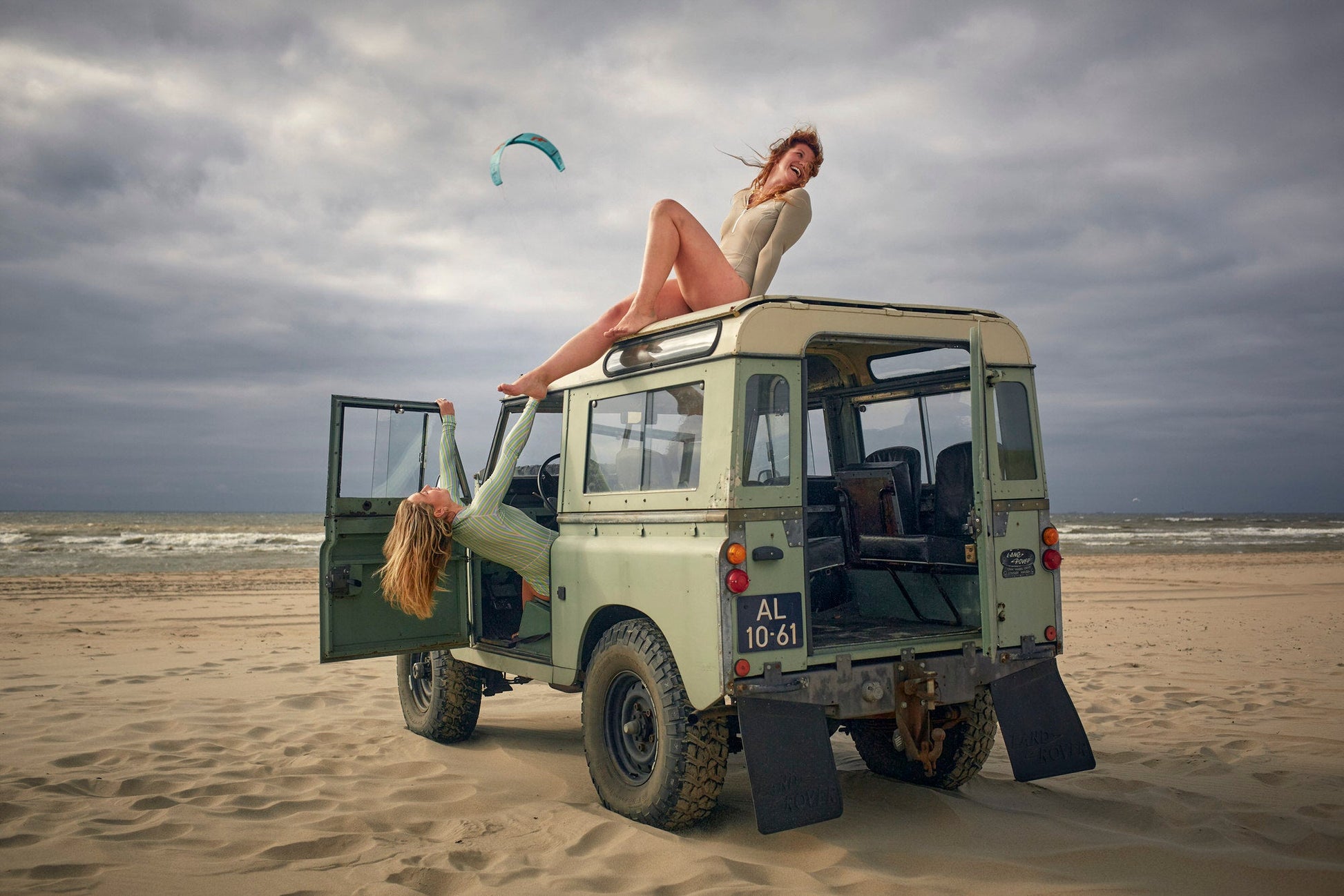 Woman laughing in a colorful long sleeve WALLIEN swimsuit atop a Land Rover, with a kite and North Sea beach in background