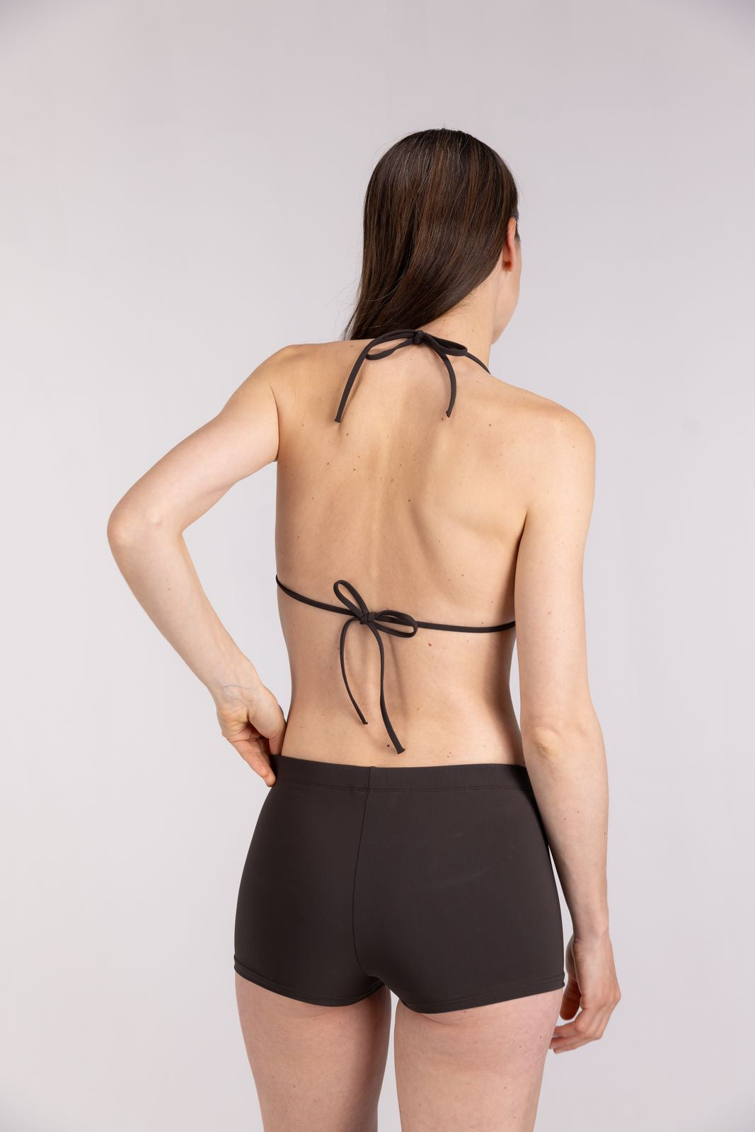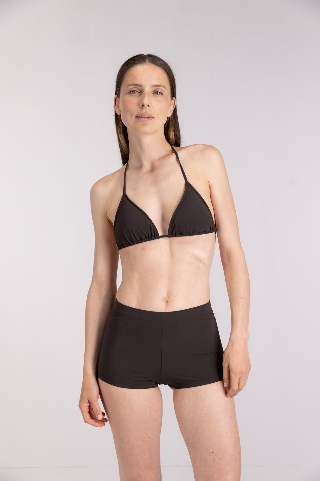 Coffee brown triangle bikini top by WALLIEN styled with hot pants, ideal for women’s surfwear, shot in studio setting