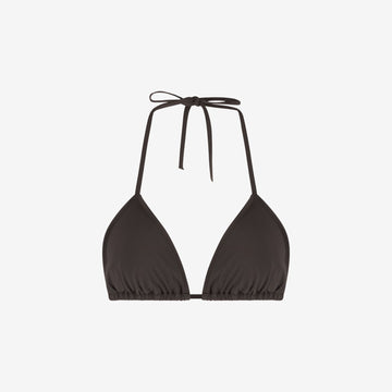 Coffee triangle bikini top with adjustable halter tie and ruched cups, designed for swim performance, on a white background