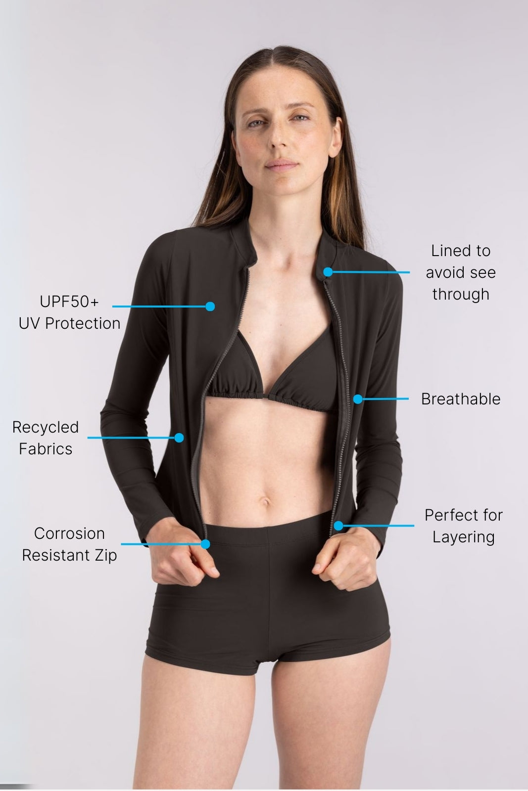 Rash Guard With Zip in Coffee layered over blue bikini top, styled for warm-up or sun protection, plain studio background
