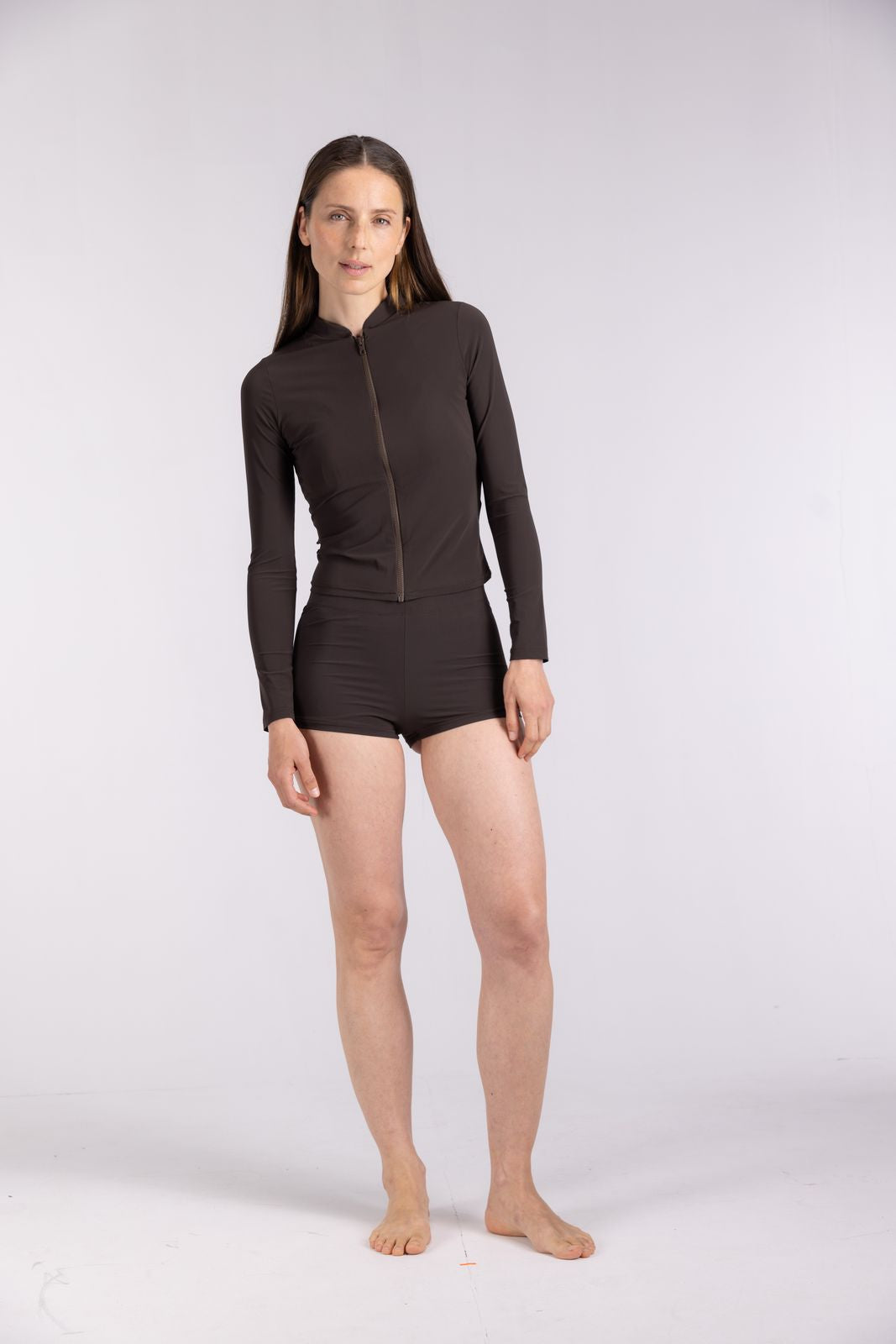 This zipped women’s rash guard offers easy wear and sleek coverage in and out of the water. Designed for surfers and swimmers, it features chlorine-resistant, sustainable fabric and flat seams for a second-skin feel.