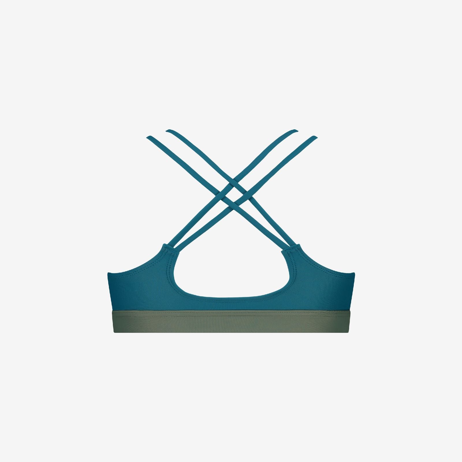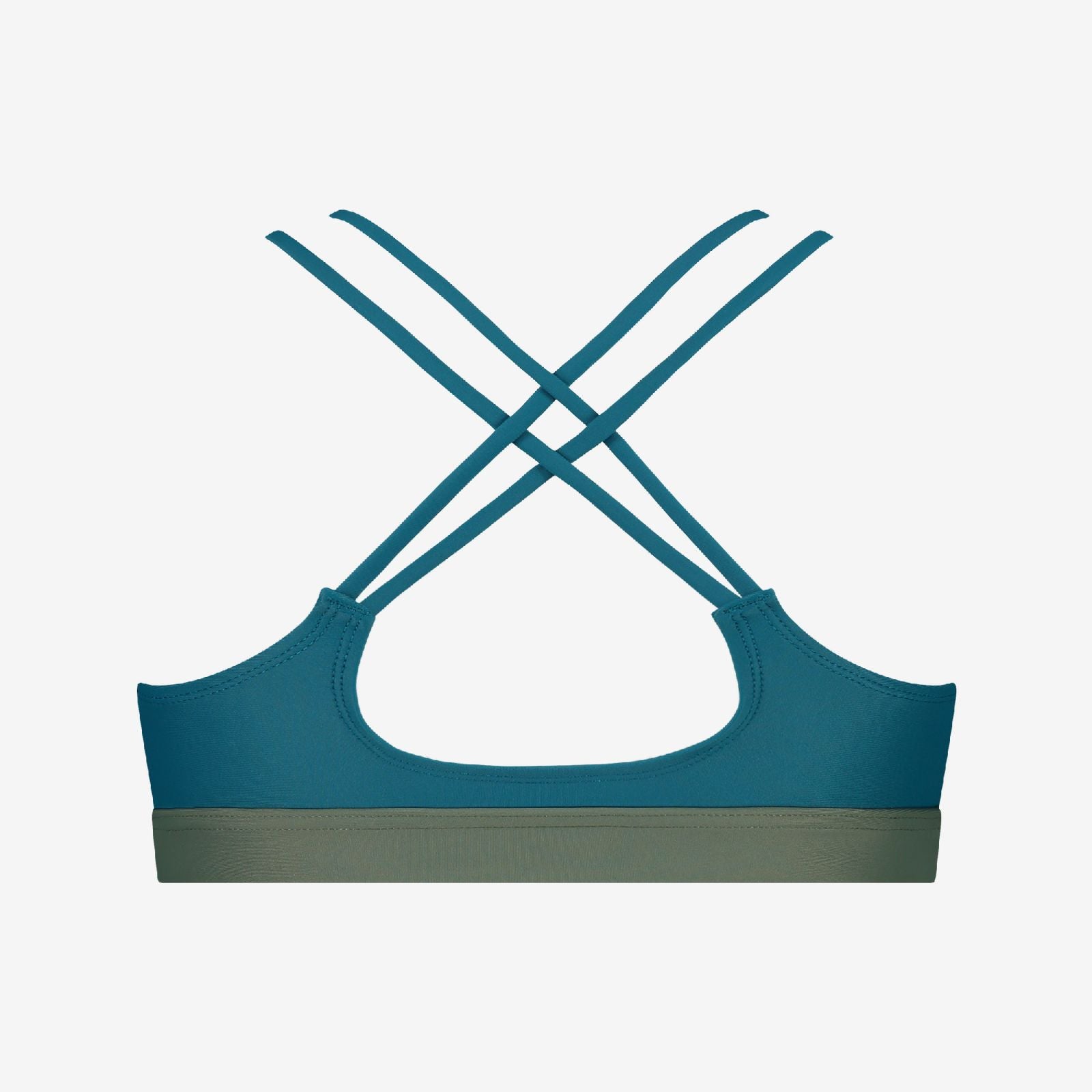 Back view of teal-green performance bikini top with crisscross straps and wide elastic band, on a clean white background