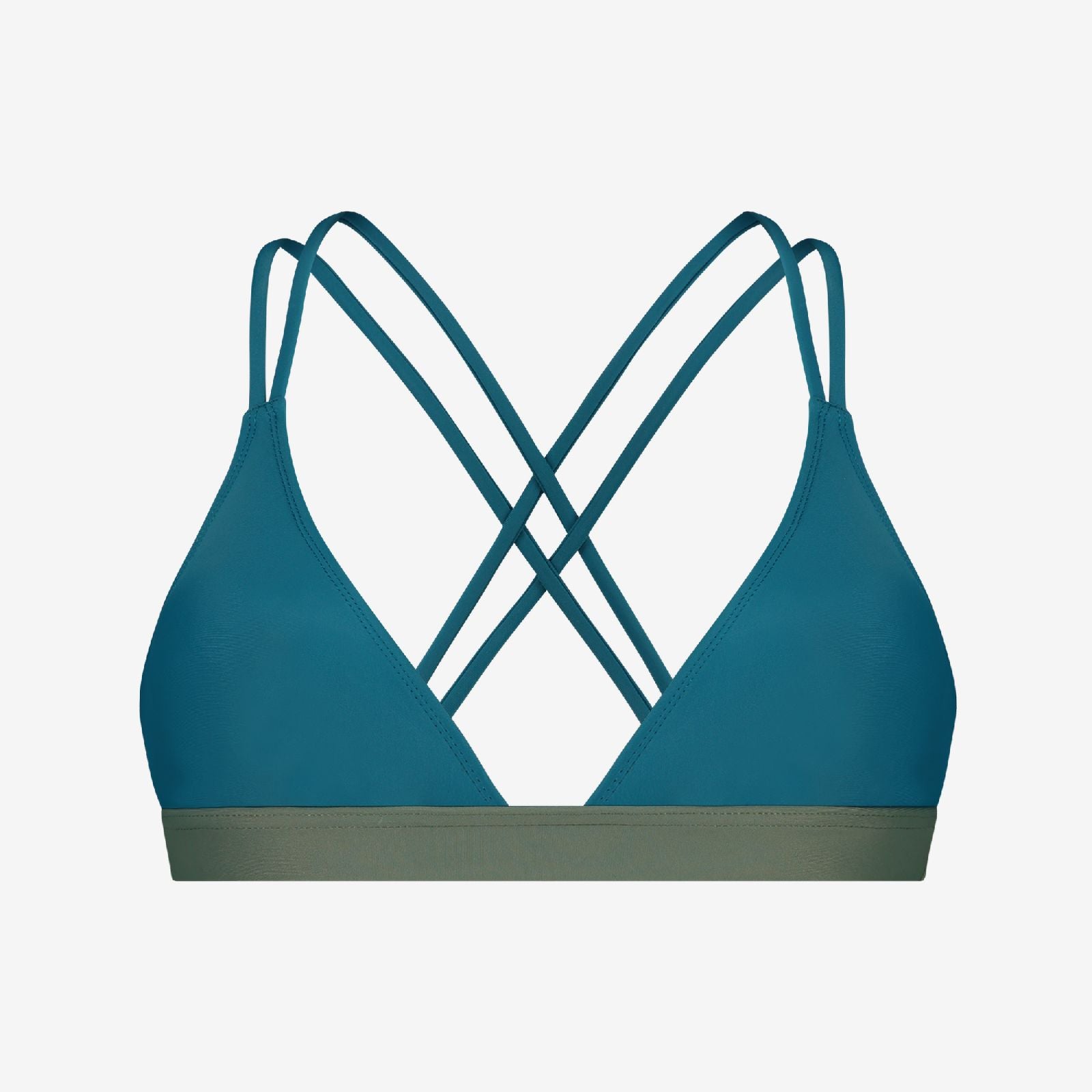Teal-green bikini top with cross-back straps and contrast green band, designed for women’s water sports, on white background