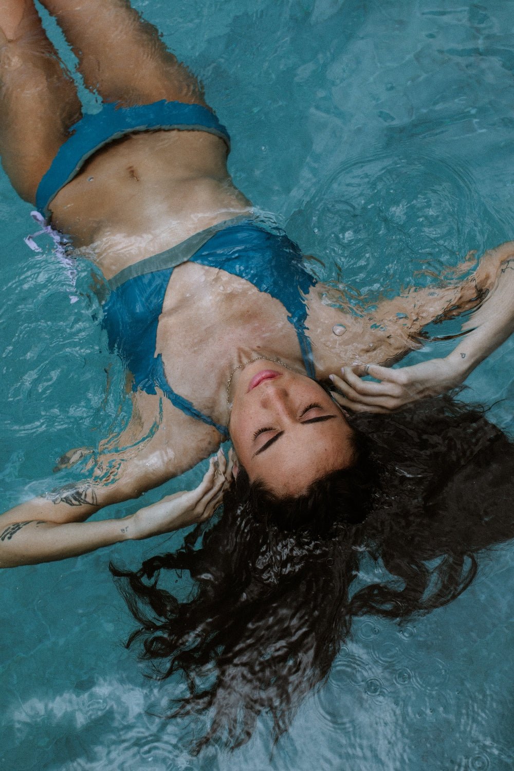 Woman floating in pool in teal-green bikini top, designed for water sports and eco-friendly swim sessions