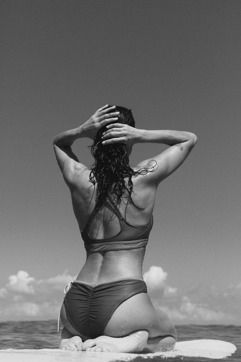 Back view of woman in cross-back bikini top sitting on surfboard, ocean horizon visible in grayscale background