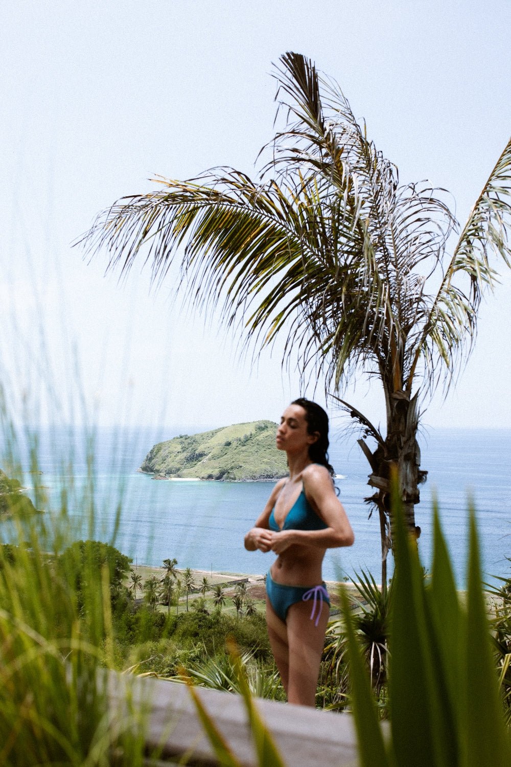 Woman in teal-green bikini top for ocean swimwear standing by palm trees, with tropical coastline and sea in background