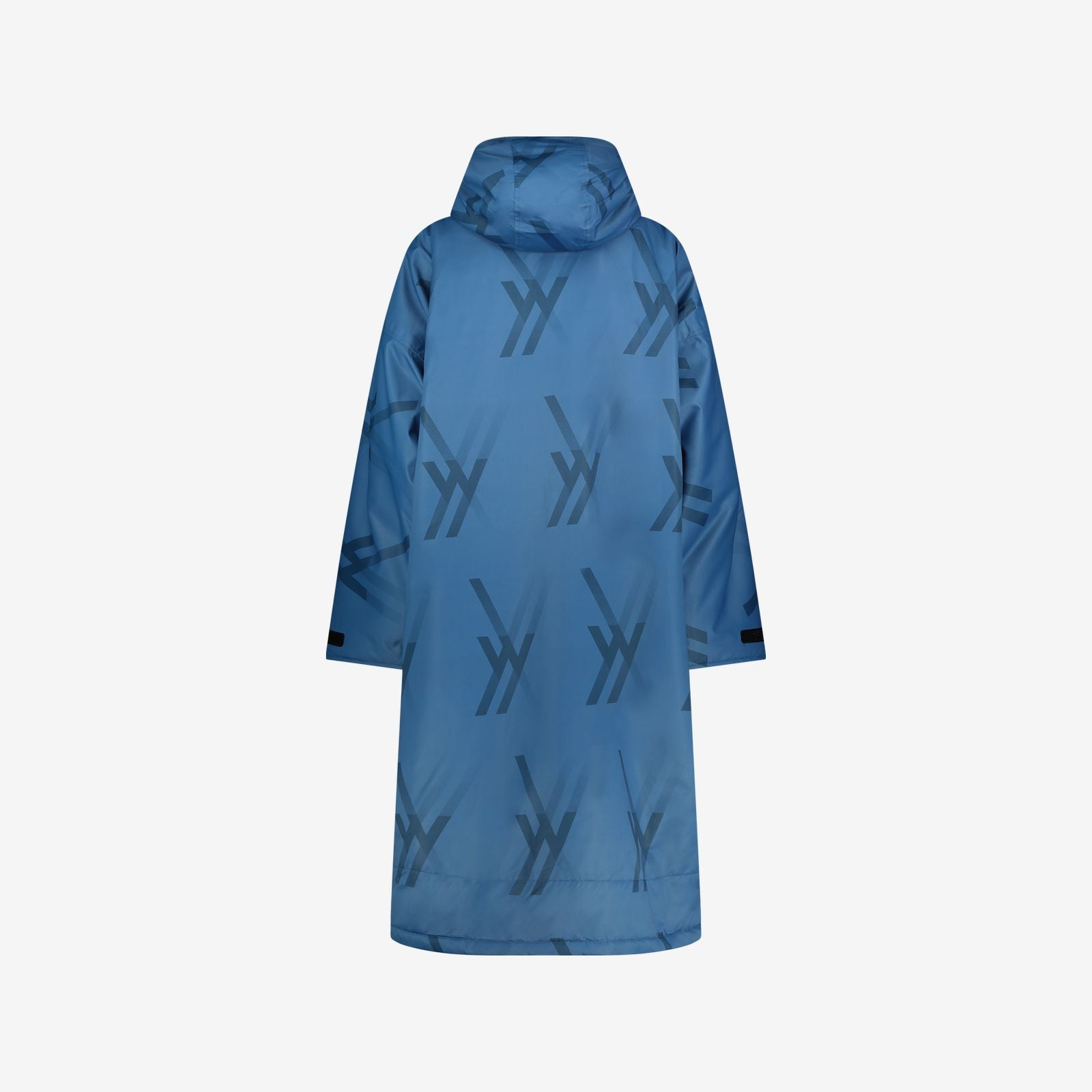 Back view of blue WALLIEN changing robe with hood and signature logo print, arms relaxed, white studio background