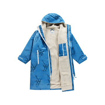 Blue WALLIEN changing robe with soft fleece lining, waterproof shell, front zip, and inner pocket, on white background