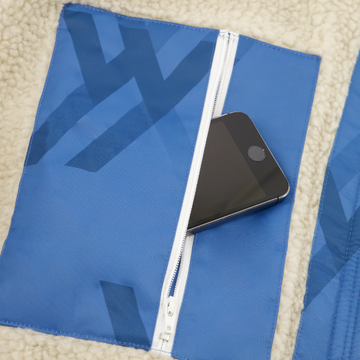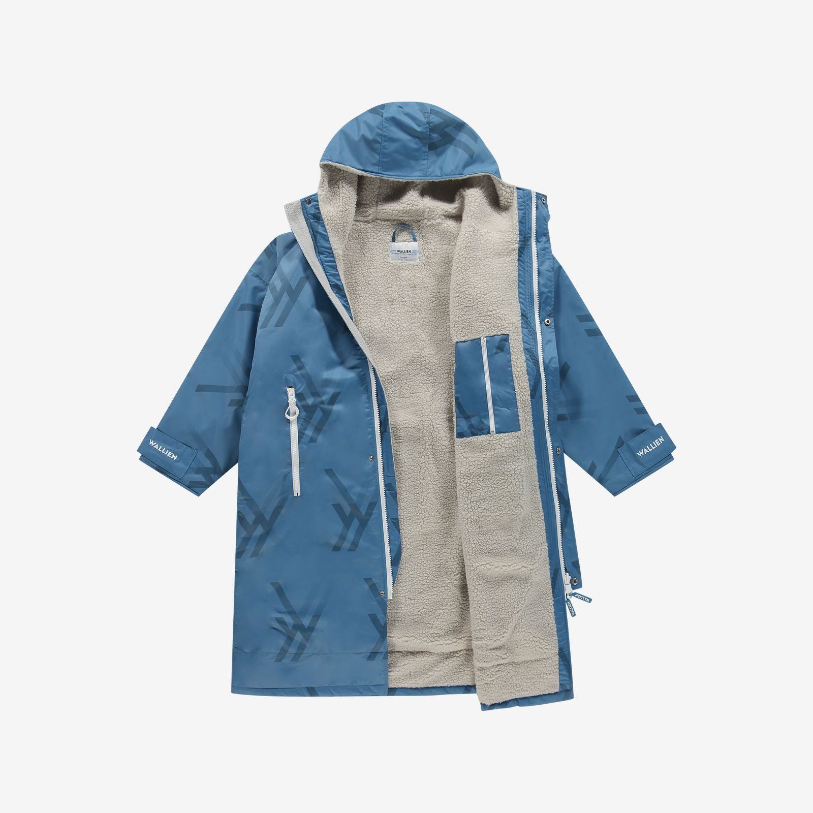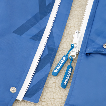 Close-up of WALLIEN zipper and logo detail on blue changing robe, sherpa lining visible, studio light background