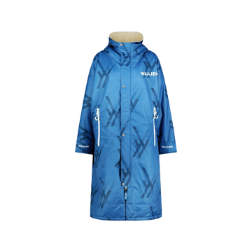 Back view of blue WALLIEN changing robe with all-over logo print and waterproof design, displayed on white background