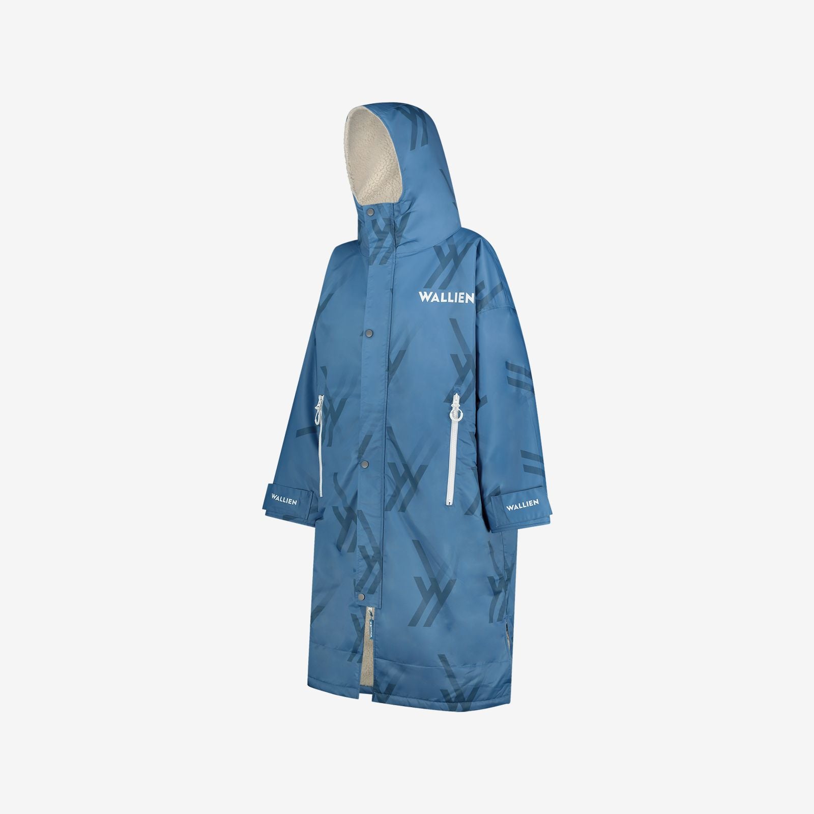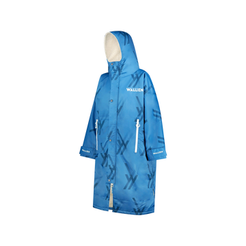 Side view of blue WALLIEN changing robe with branded sleeve, hood, and zip pockets, shown on white background