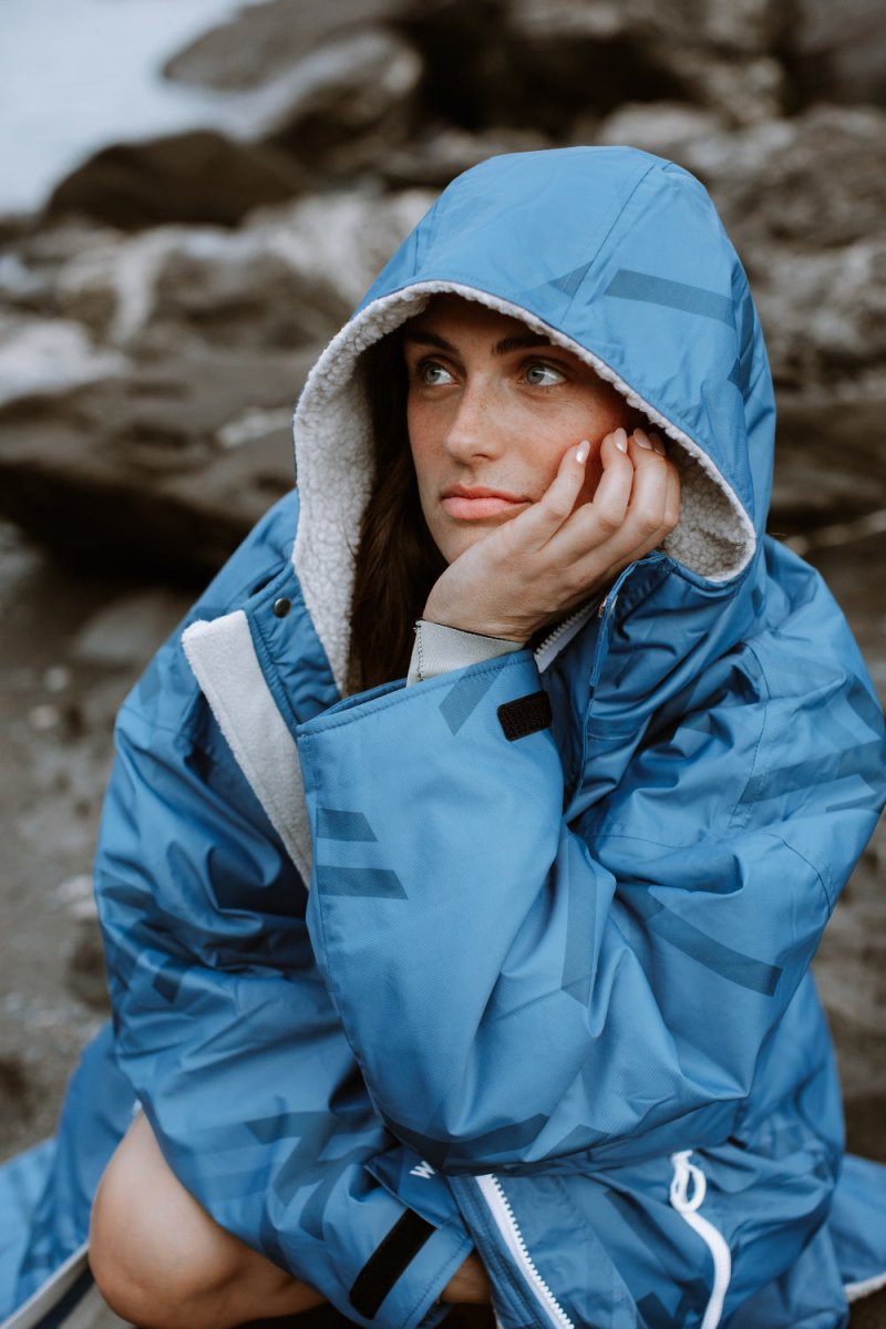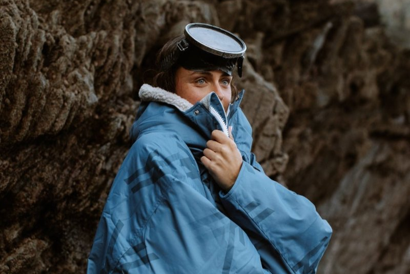 Woman in WALLIEN blue changing robe warming up post-swim, rugged coastal rocks in background after water activity