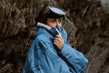 Relaxing in cozy WALLIEN blue changing robe after cold water swim, seated on rocks with coastal background