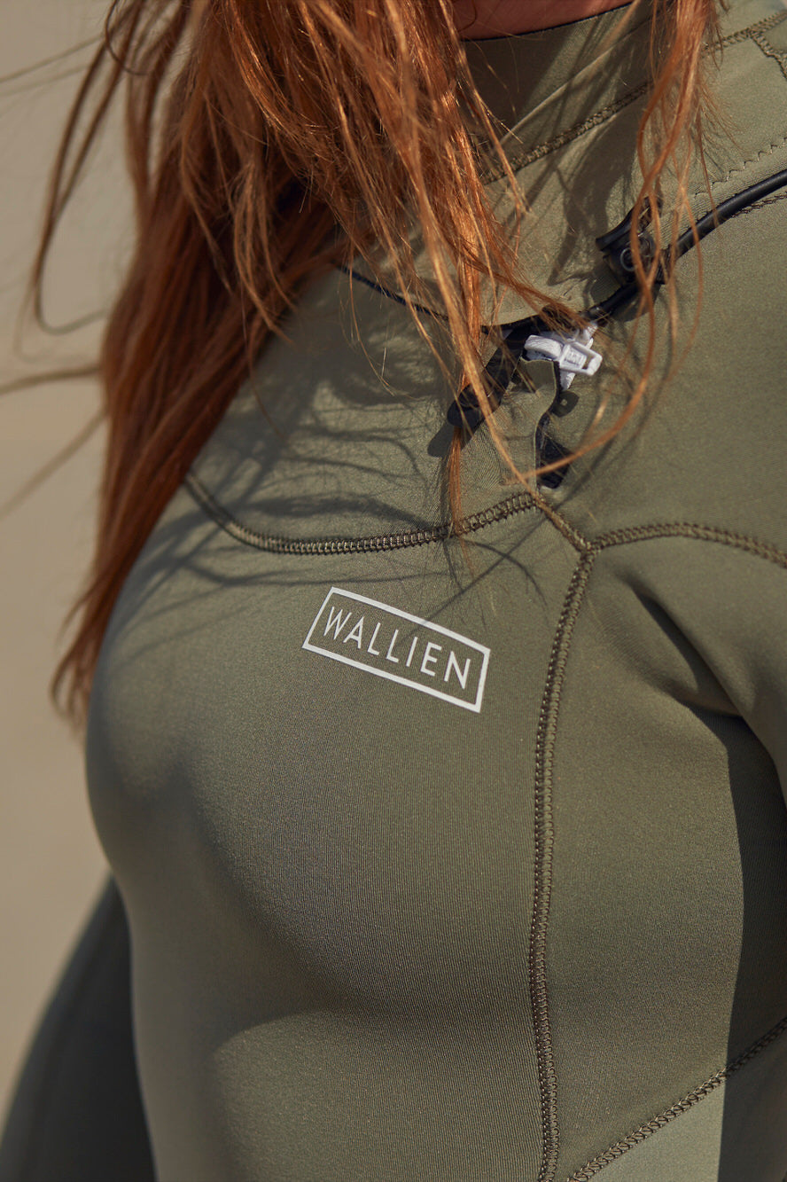 Beige 4/3 & 3/2mm women's wetsuit with chest zip, black knee panels and WALLIEN branding, for watersports on white background