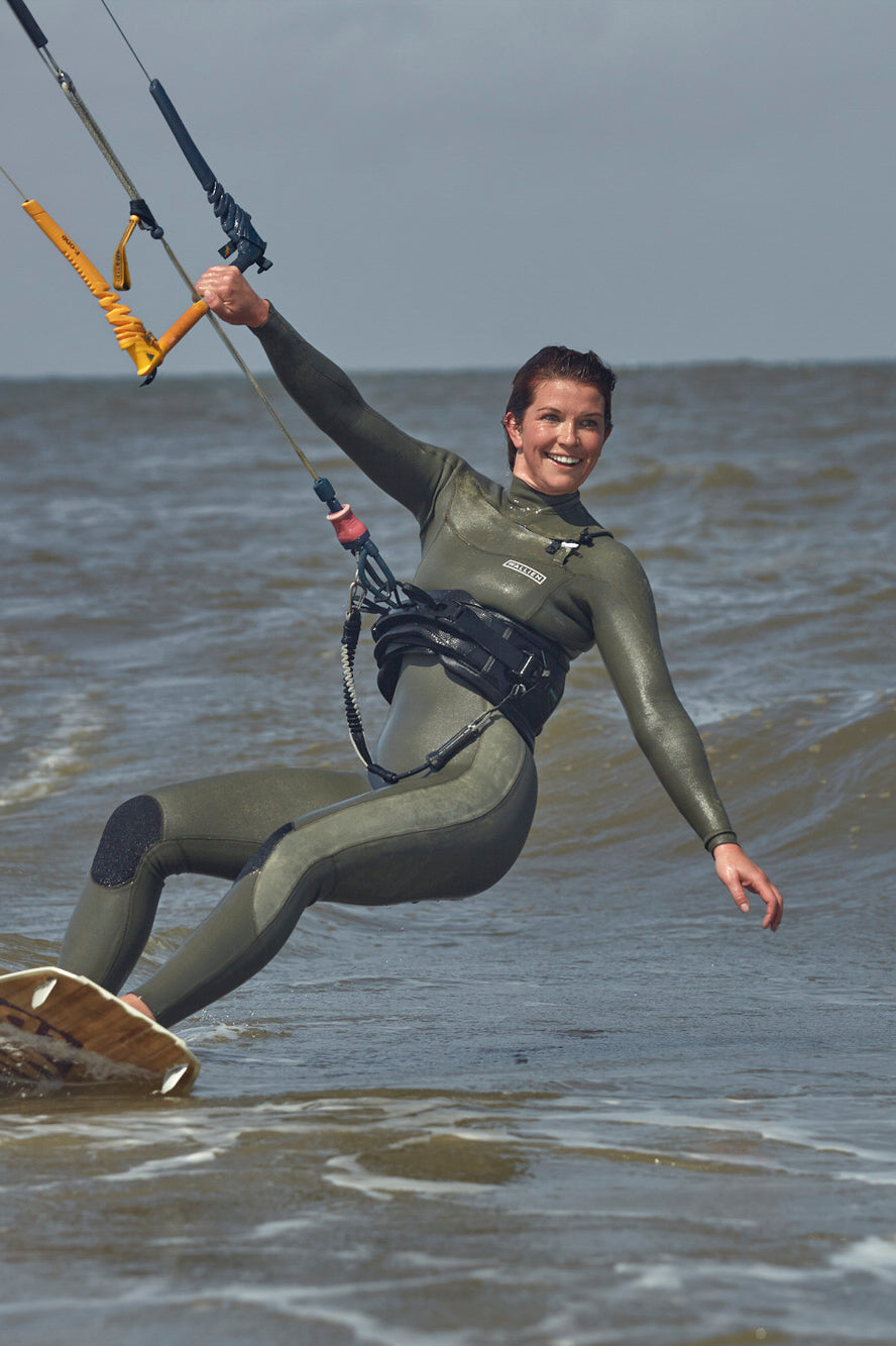Woman kitesurfing in Nikki van Dijk 3/2 wetsuit on a windy beach day, for watersports with board and sky trails in background
