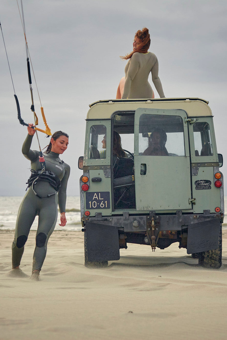 Women kitesurfing and resting on vintage car in Nikki van Dijk 3/2 wetsuit, with ocean and cloudy sky in background