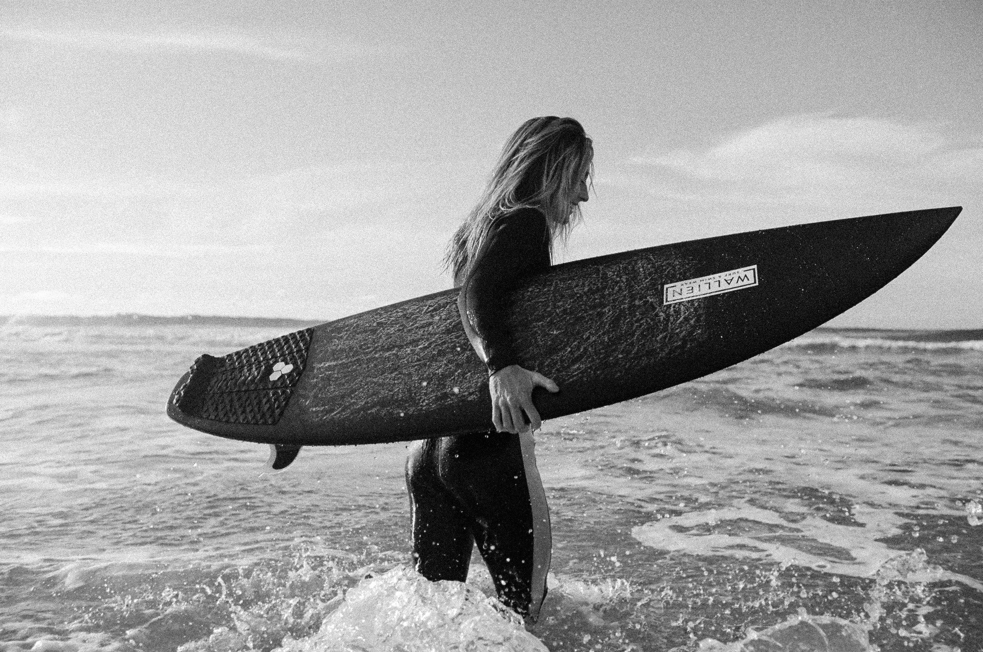 Surfer walking out of ocean in WALLIEN 4/3 wetsuit with black surfboard, waves and cloudy sky in background (black & white)