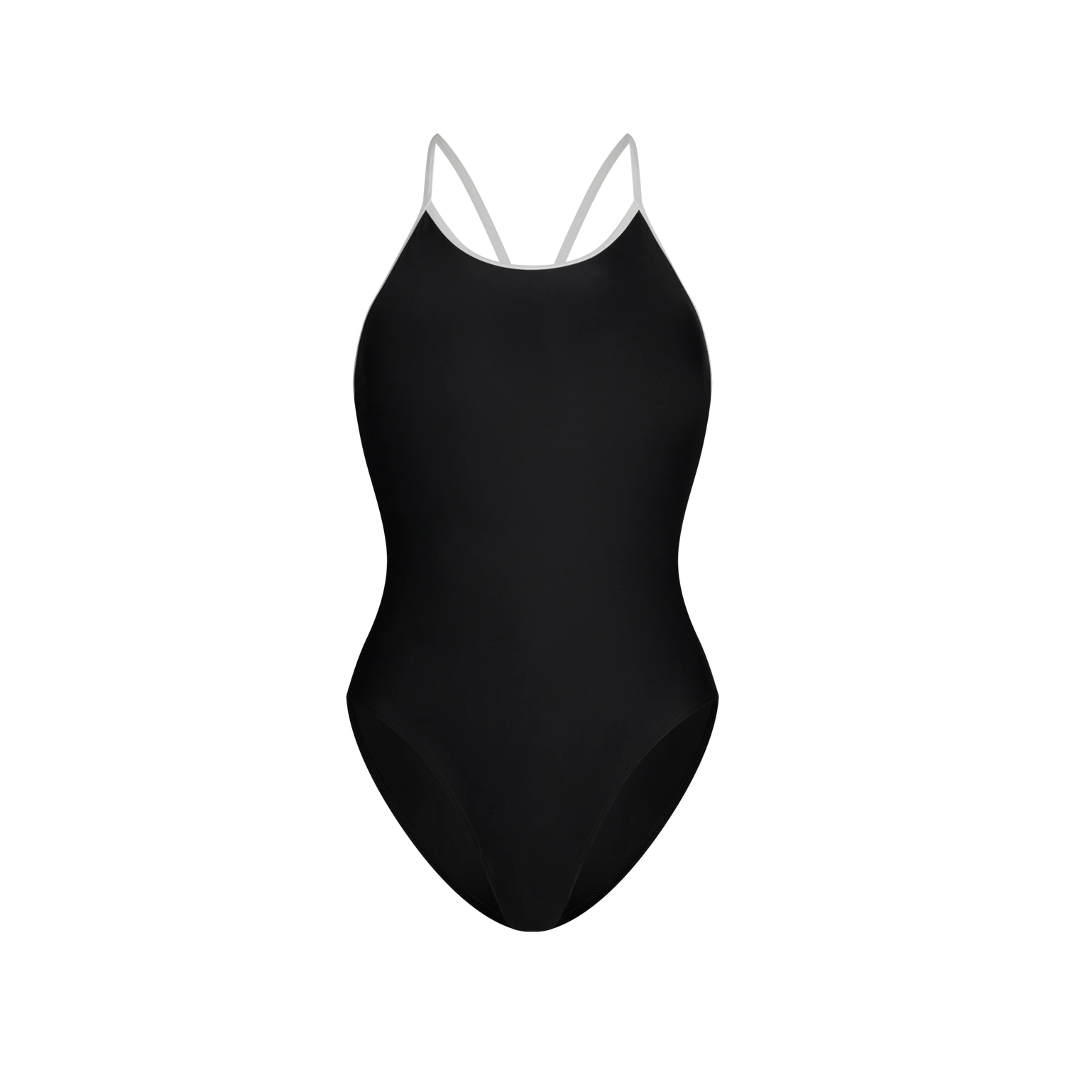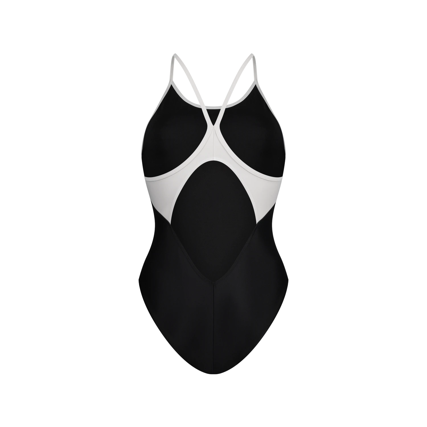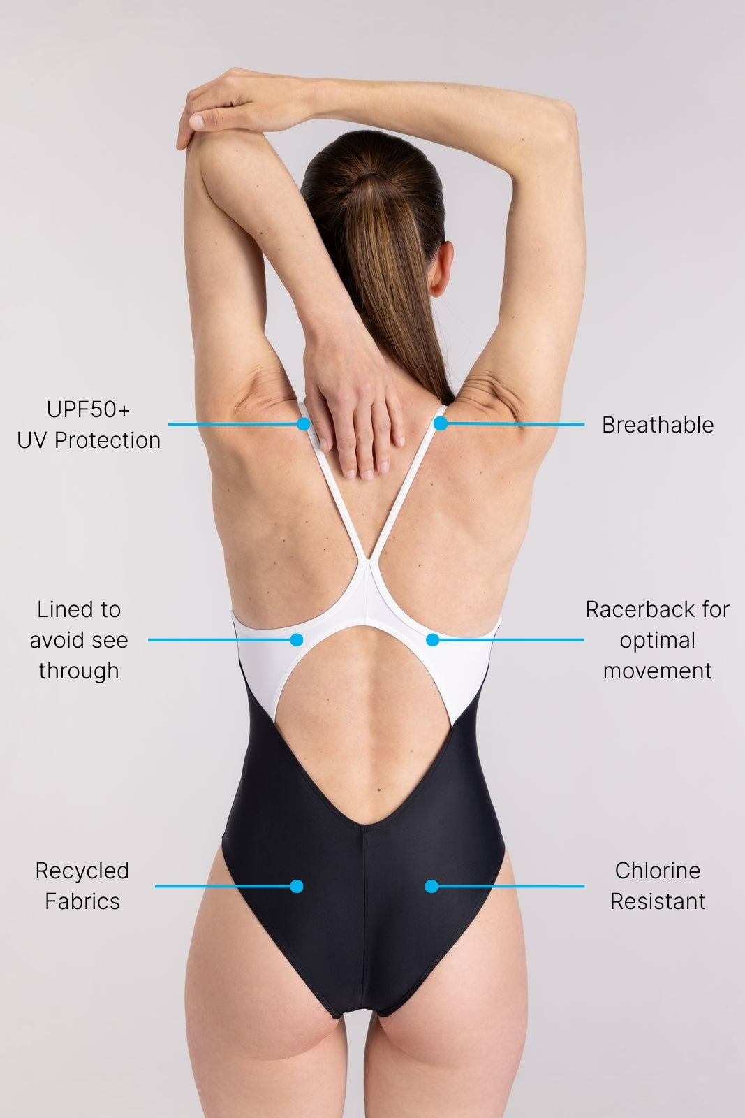 Racerback swimsuit in black with open back and white straps, designed for swim mobility and support, on a white background
