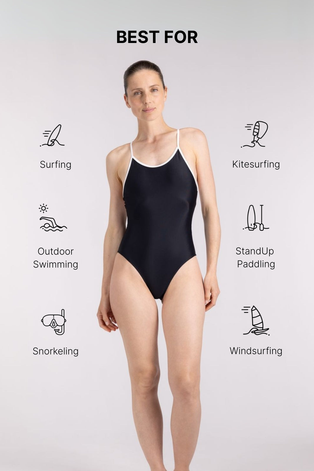 Black high-cut one-piece swimsuit with white straps, designed for women’s water sports performance, on a white background